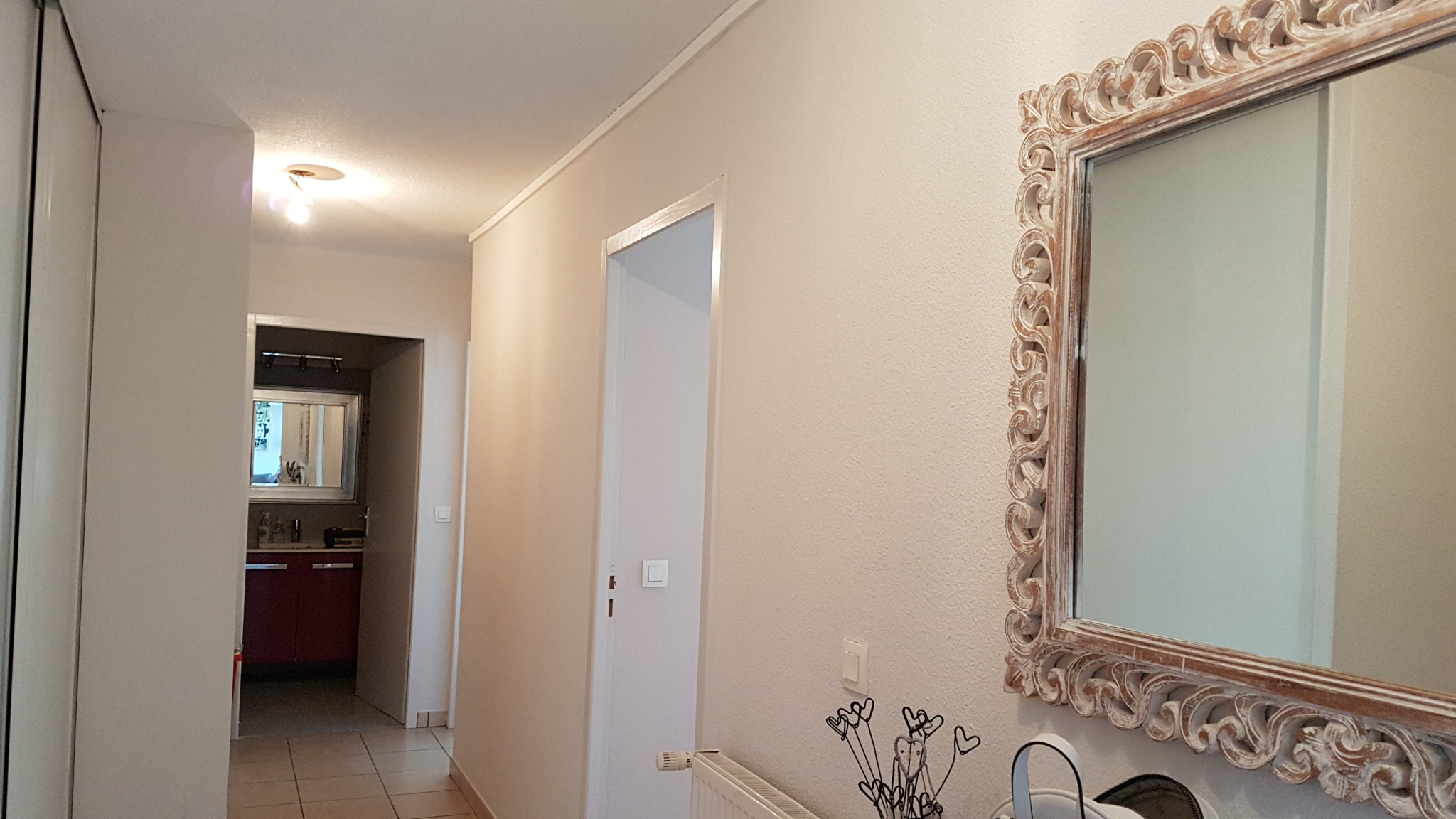 Bel appartement de 3 pièces dans un immeuble de 2005 composé d'une entrée avec placard, 2 chambres dont une avec placard, une salle d'eau moderne avec douche italienne, une pièce de vie (cuisine équipée/séjour) avec accès balcon de 10m². Parking collectif avec barrière et cave. Vue dégagée. Chauffage individuel au gaz avec thermostat programmable. Appartement situé à proximité des écoles (maternelle, primaire, collège et lycée), des commerces, du marché...