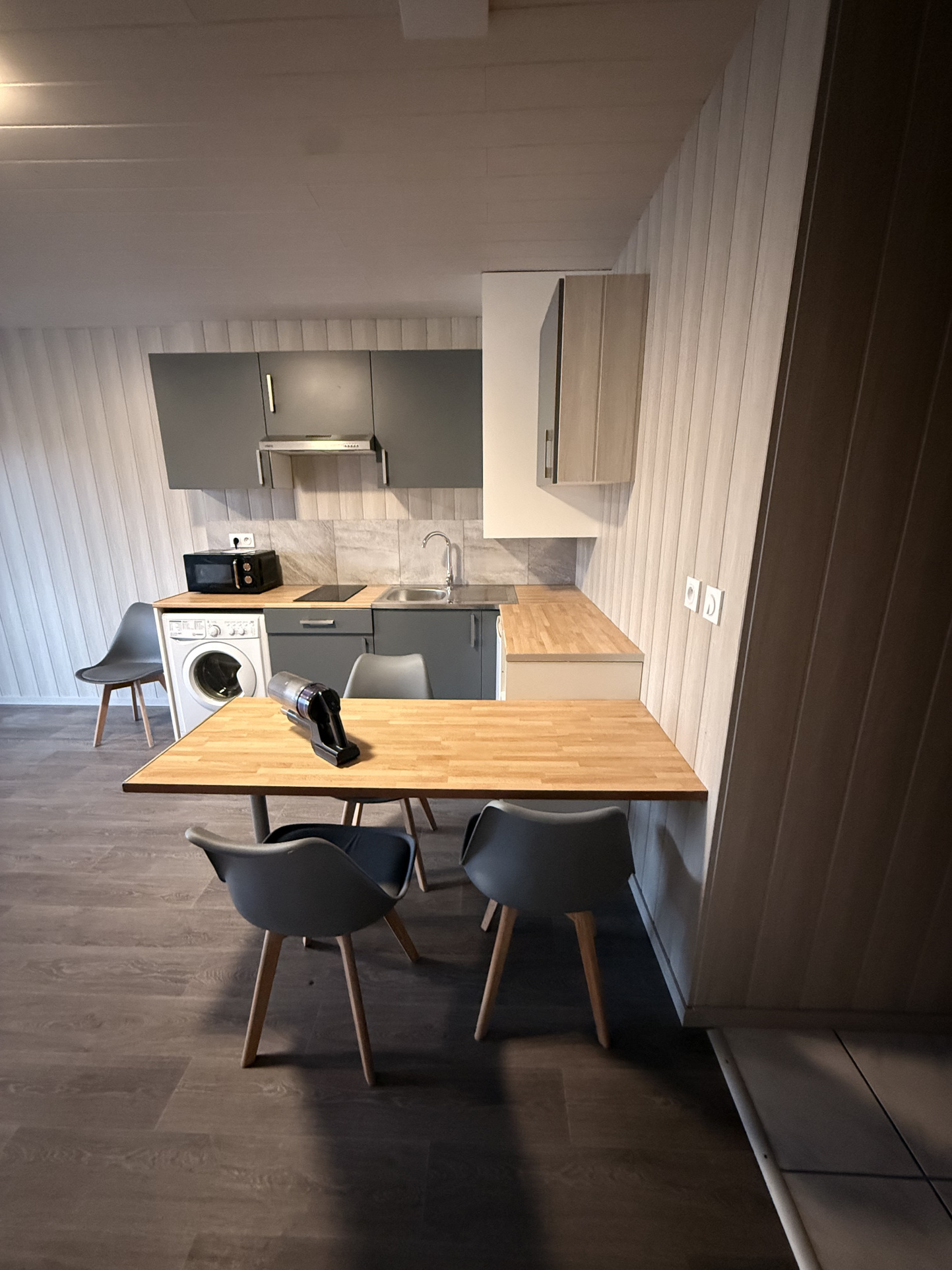 5.69 | Rez-de-chaussée | équipée d'un frigo, hotte, plaque à induction, micro onde, machine lave linge, avec placard, une table à manger et 4 chaises |
